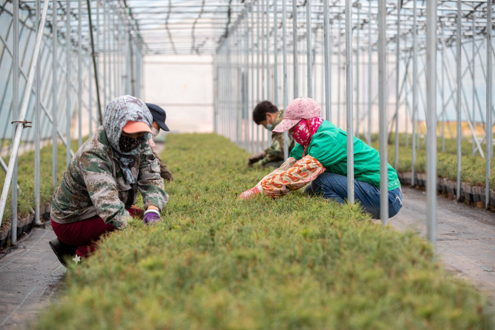 在黑龍江伊春森工集團紅松種苗繁育基地,工作人員在養護輕基質紅松苗(2023年5月20日攝)。新華社記者 張濤 攝