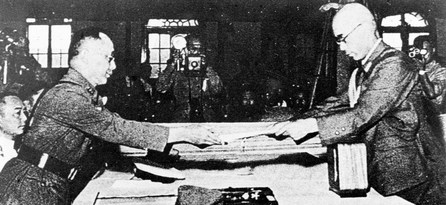 1945年9月9日,何應欽(左)在南京代表中國政府接受侵華日軍總參謀長小林淺三郎遞交的侵華日軍總司令岡村寧次簽署的投降書。新華社